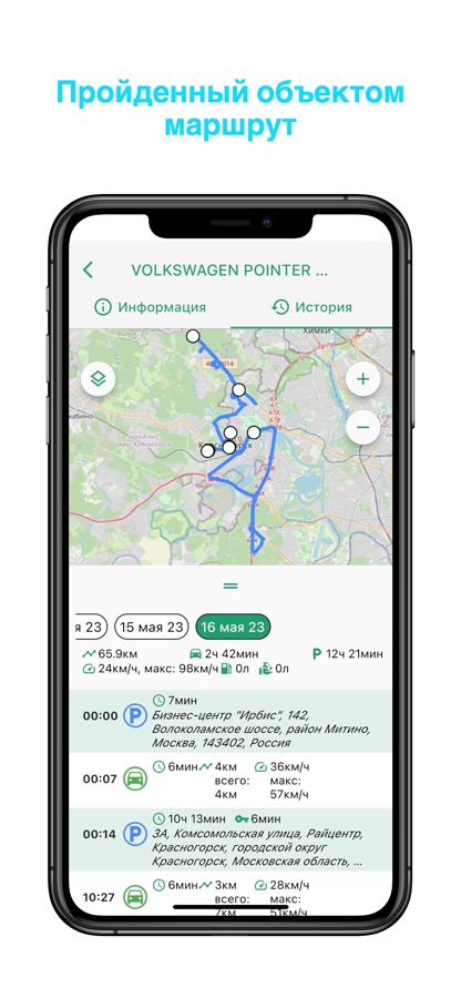 В Приложении можно сформировать отчеты по объекту мониторинга за выбранный период, в которых указываются такие параметры, как общий километраж, средняя и максимальная скорость, время в пути, расход топлива.
