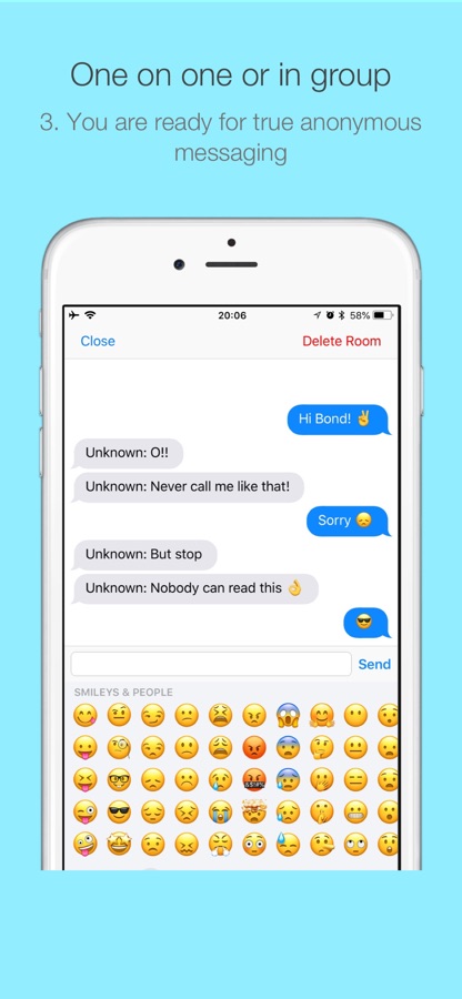 — приложение не хранит никаких идентификаторов устройства, только когда пользователи в комнате они могут получать и отправлять сообщения.