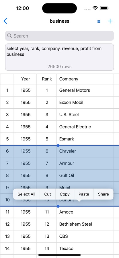 You can also tap and drag to highlight any table or rows for copy, paste, and share. The app also automatically formats SQLite query results to fit each column perfectly for thousands of rows in a few seconds.
