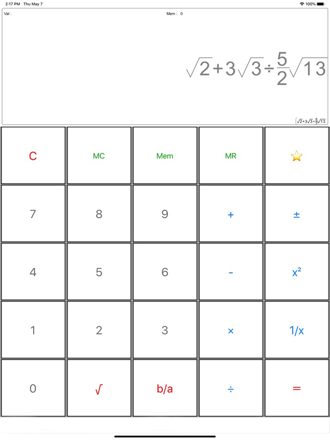 It is a calculator for calculating the square root. It can also be used to calculate fractions. You can easily enter and execute the four rule calculations of square root and square root. Since the infinite multiple-long integer is used I the internal operation, there is no worry that the digits will overflow. Especially easy to carry out rationalization which is said to be difficult to calculate.
