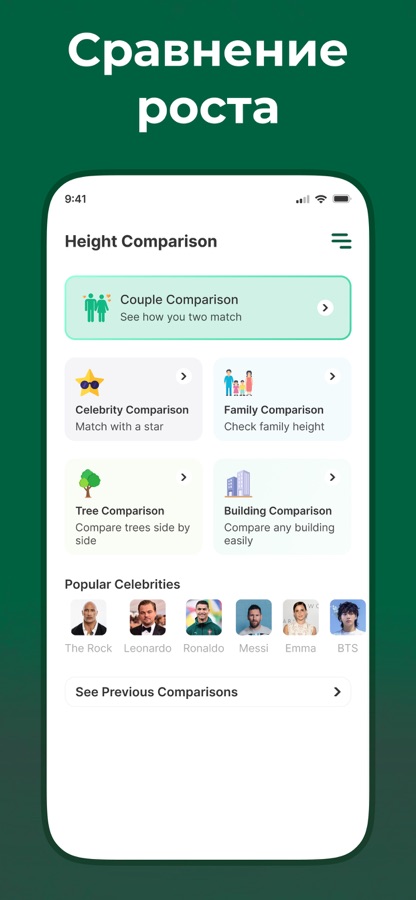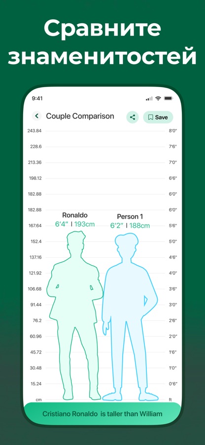 Скачайте удобное приложение Сравнение роста: см и футы уже сегодня, чтобы измерять, сравнивать и визуализировать рост людей и знаменитостей в сантиметрах или футах. Узнайте, кто выше, создавайте графики сравнения роста и наслаждайтесь увлекательным и точным опытом измерения роста.
