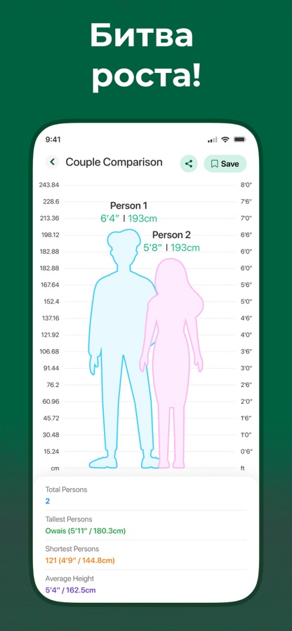 Это приложение для сравнения роста показывает результаты в сантиметрах, футах и наглядных графиках, помогая ясно понять различия в росте.
