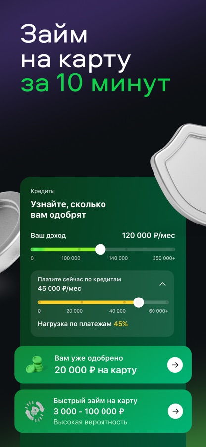 Сервис кредитования, который учитывает вашу кредитную историю и бесплатно подбирает кредиты наличными с высокой вероятностью одобрения среди 20 банков, а также экспресс микрозаймы без процентов. Он позволяет отправить заявку, рассчитать условия, получить одобрение за пару минут и оформить кредит онлайн.