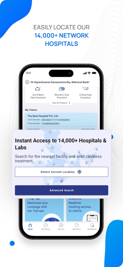 Locate your nearest network and non-network hospitals and labs through the app, ensuring quick and convenient access to the best available healthcare facilities.