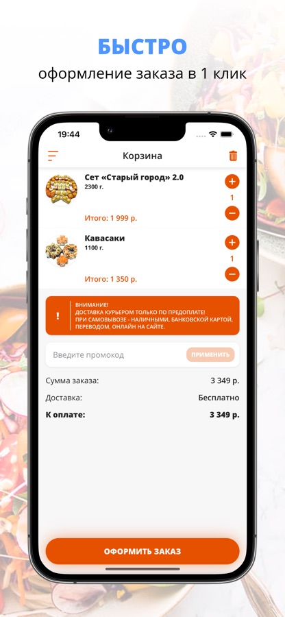 Скачивайте наше приложение, оформляйте заказ и наслаждайтесь любимой едой, где бы Вы ни были! Приятного аппетита!