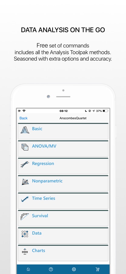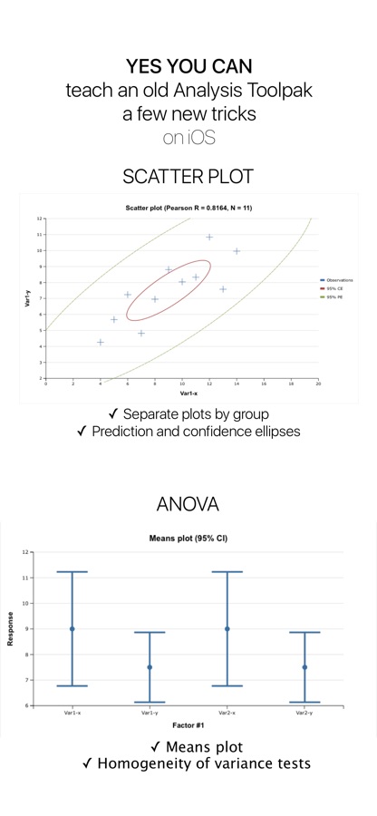 StatPlus позволяет пользователям iOS выполнять различные методы анализа данных — от базовых методов до сложного анализа, включая методы непараметрической статистики, дисперсионный анализ ANOVA, регрессионный анализ (включает анализ остатков, тесты гетероскедастичности, диагностику коллинеарности), анализ выживаемости — пробит анализ и расчет ЛД50, анализ кривых ROC и сравнение ROC кривых, таблицы дожития (таблица смертности), процедура Каплана-Мейера), анализ временных рядов (автокорреляционный анализ, тесты единичного корня), контроль качества и другие методы анализа и визуализации данных.