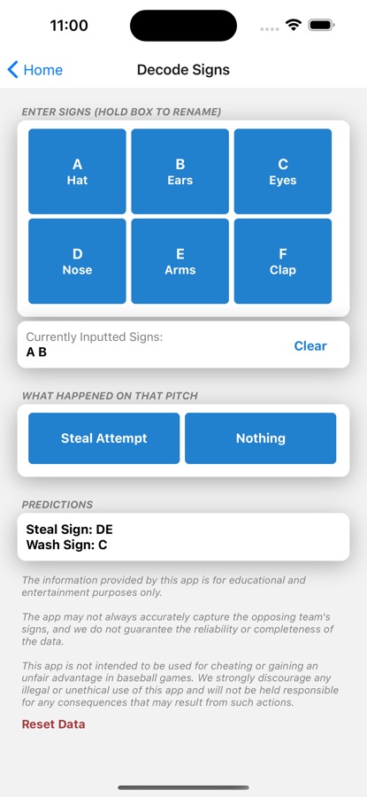 [x] Please be sure to always follow your league’s rules. We do not encourage cheating, and are not responsible if you get in trouble using the Steal Sign Stealer. This app is intended for entertainment purposes.