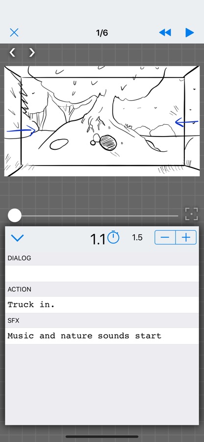 Use the simple drawing interface to sketch a panel or import (with drag and drop) from any other app. Set the timing, write dialog, action, and SFX for each panel. Play the board back as an animatic to get a feel of your final project.