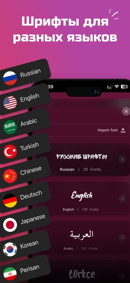 Галерея шрифтов – выберите из 400+ крутых шрифтов (английские, арабские, фарси, турецкие, китайские, японские, русские шрифты и многие другие).