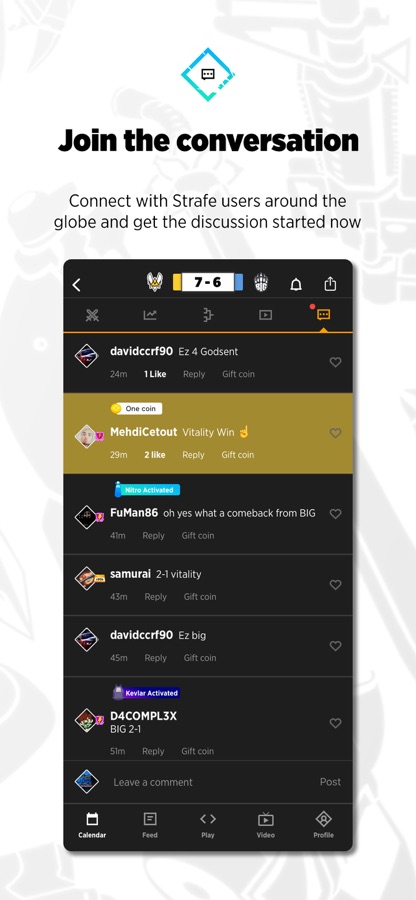 Настрой аккаунт по своему вкусу, подтверди адрес электронной почты и стань частью сообщества Strafe! Поднимайся в рейтинговой таблице и получай значки за познания в области киберспорта, а затем сравнивай эти успехи с другими пользователями Strafe!
