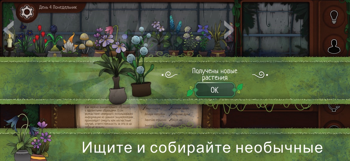 Исследуйте окружающие места в поисках новых растений. Только будьте осторожны! Темные леса и глубокие озера порой таят опасность для беззащитных ботаников. Вы можете открыть для себя немыслимую силу… или лишиться рассудка. Используйте подсказки, чтобы понять, куда лучше отправиться и где бывать не стоит.