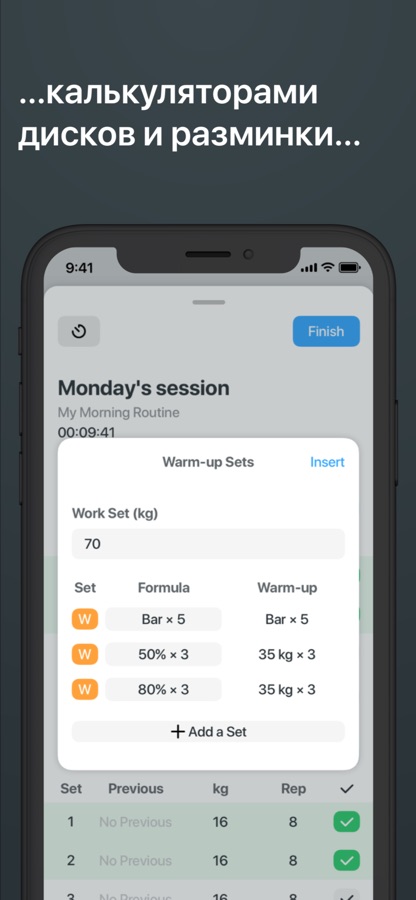 • Калькулятор разминки покажет, с каким весом нужно разминаться.