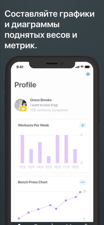 • Развитая статистика показывает ваш прогресс и рекорды, а также вычисляет максимальное количество повторов и общий поднятый вес!