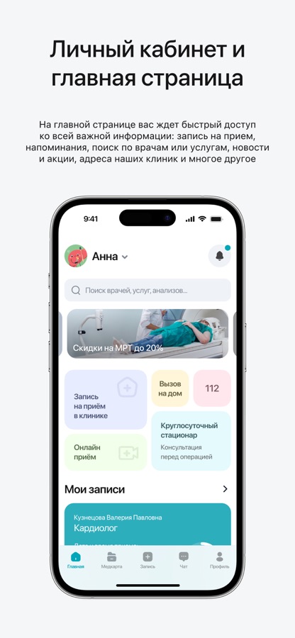На главной странице вас ждет быстрый доступ ко всей важной информации: запись на прием, напоминания, поиск по врачам или услугам, новости и акции, адреса наших клиник и многое другое.