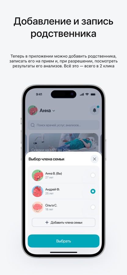 Теперь в приложении можно добавить родственника, записать его на прием и, при разрешении, посмотреть результаты его анализов.
