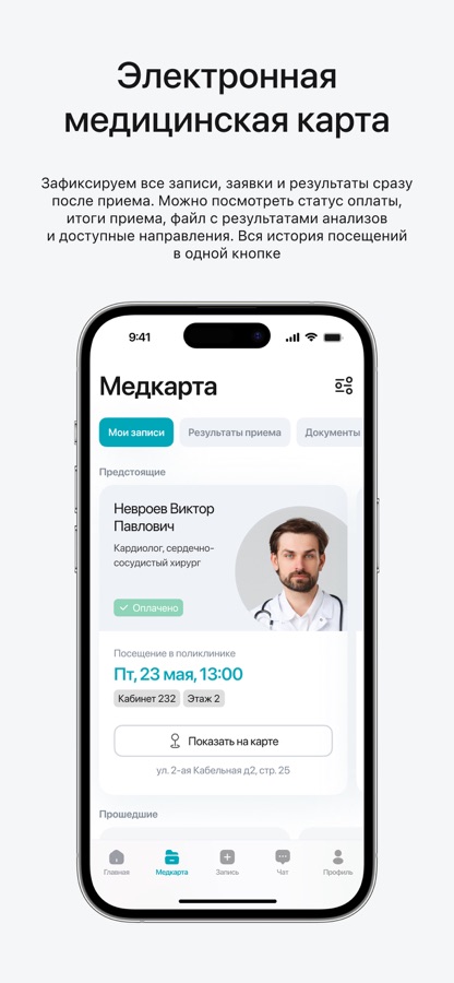 Мы упростили запись на прием, разделив её на несколько категорий: прием в клинике, онлайн-консультации, консультации перед операцией, вызов врача на дом и чекапы. Вы сможете выбрать удобное время, оплатить прием через приложение и даже установить таймер, чтобы не забыть о визите в клинику.