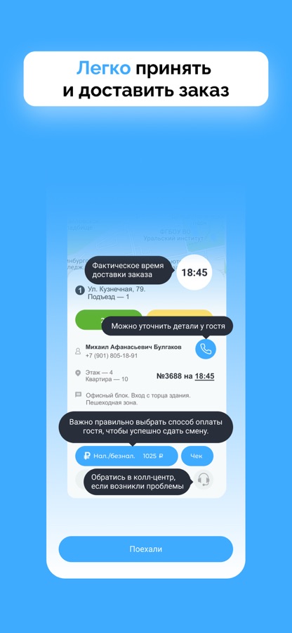 С помощью приложения автоматизирован процесс получения заказа и его доставки в черте города.