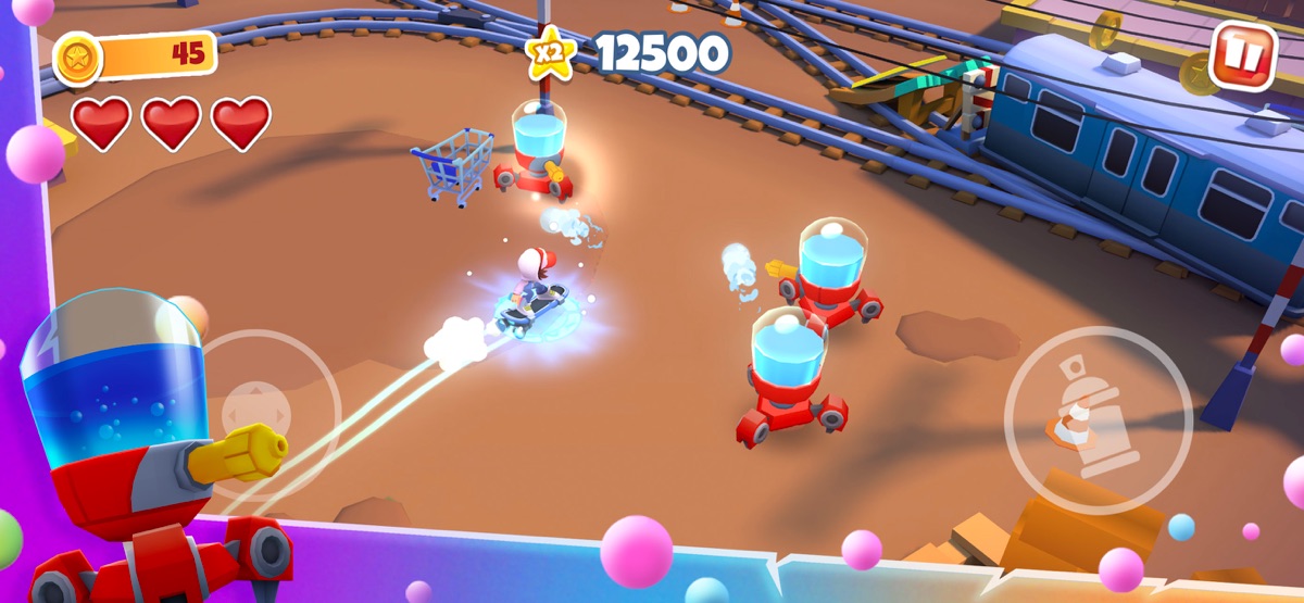 Устанавливай рекорды! Катайся по арене, скользи по рейлам, прыгай, поражай цели и поливай краской роботов, чтобы выполнять комбо. Убегай от охранника и его команды, которые хотят положить конец веселью.