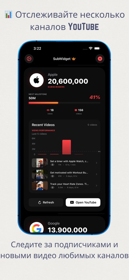 SubWidget — самый быстрый способ отслеживать рост любого публичного канала YouTube прямо с главного экрана или экрана блокировки вашего iPhone с помощью виджетов в реальном времени.
