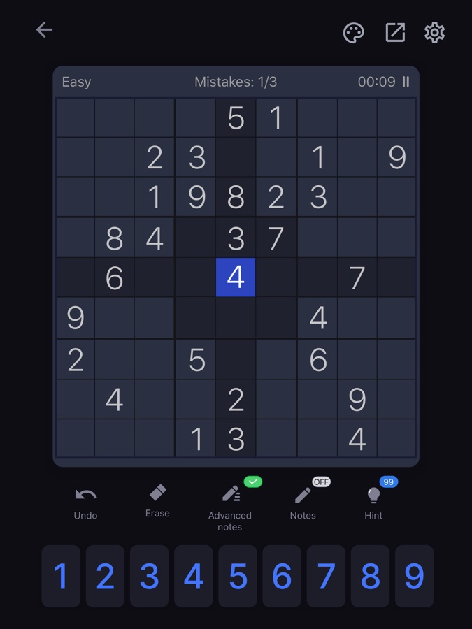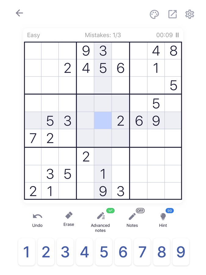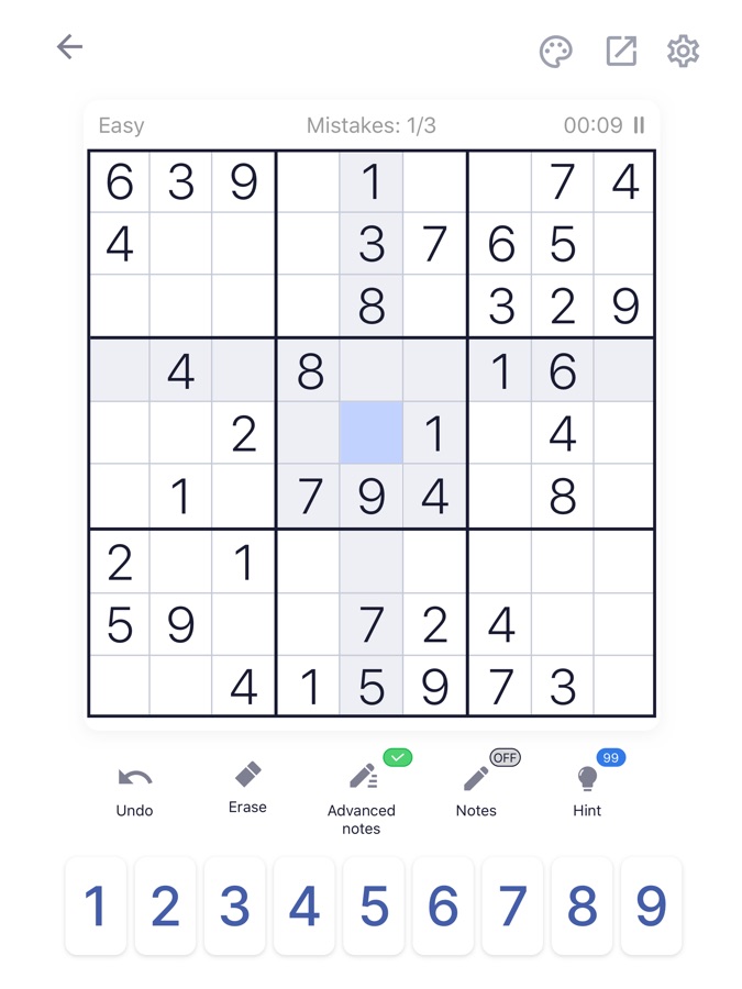 1. Включите функцию черновика, чтобы не забывать, какие цифры возможны в конкретной клетке. Заметки автоматически обновляются по мере заполнения поля.