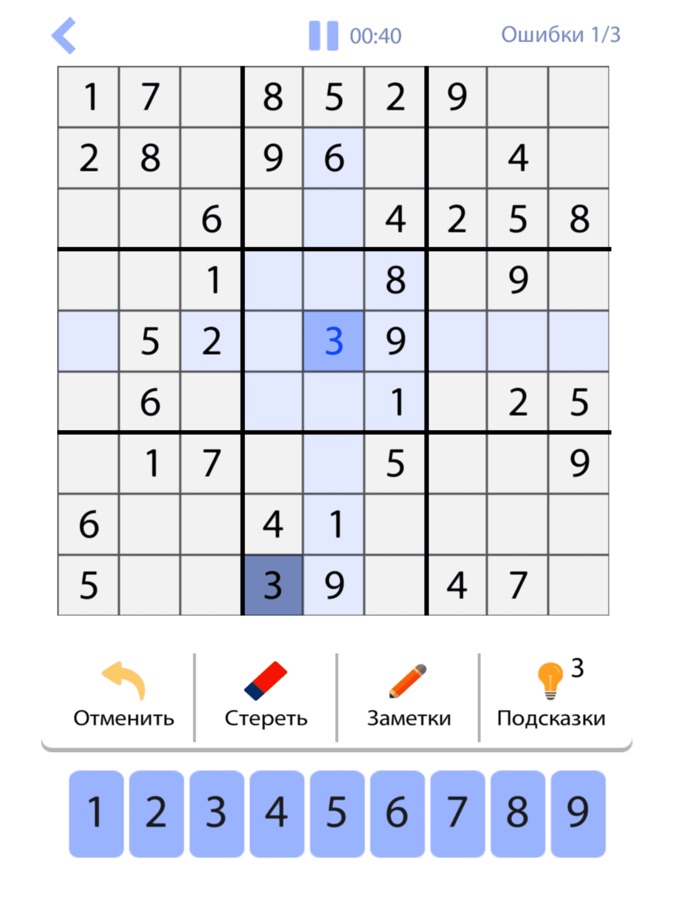 Судоку — это логическая игра-головоломка с числами, вам нужно поместить числа от 1 до 9 в каждую ячейку сетки так, чтобы каждое число могло появляться только один раз в каждой строке, каждом столбце и каждой мини-сетке. При этом вы можете выбрать строгие настройки, при которых максимально можно сделать 3 ошибки. Либо не включать эту функцию и играть с любым количеством ошибок.