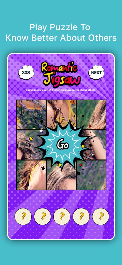 Romantic jigsaw helps you know better about other people before you contact them. The photos of other users will be made as jigsaw puzzles. When you play the jigsaw puzzle, you will look closer to the users’ photos and know more about them. After you finished 5 jigsaw puzzles successfully, you can chat with one of them for free.