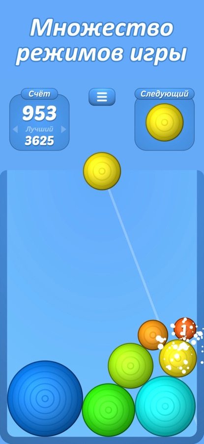 — Одинаковые шарики при соприкосновении будут объединяться в шарики большего размера.