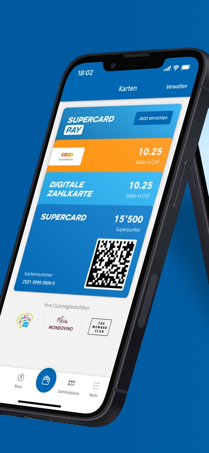 Beim nächsten Einkauf einfach den Supercard Code an der Kasse* zum Punkte sammeln vorweisen. Und mit der in der App integrierten digitalen Zahlkarte bezahlen Sie Ihre Einkäufe an allen Kassen der Coop Gruppe* bargeldlos. Sobald Sie in der App mit Ihrer Supercard ID angemeldet sind, haben Sie Ihren Supercard Code, die digitalen Bons sowie die Digitale Zahlkarte immer dabei.