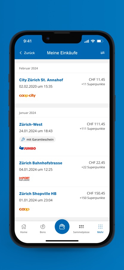 • Digitale Zahlkarte: Mit der Digitalen Zahlkarte bargeldlos bezahlen* und jederzeit an den Kassen der Coop Gruppe aufladen oder via Übertrag Ihrer Superpunkte aufladen.