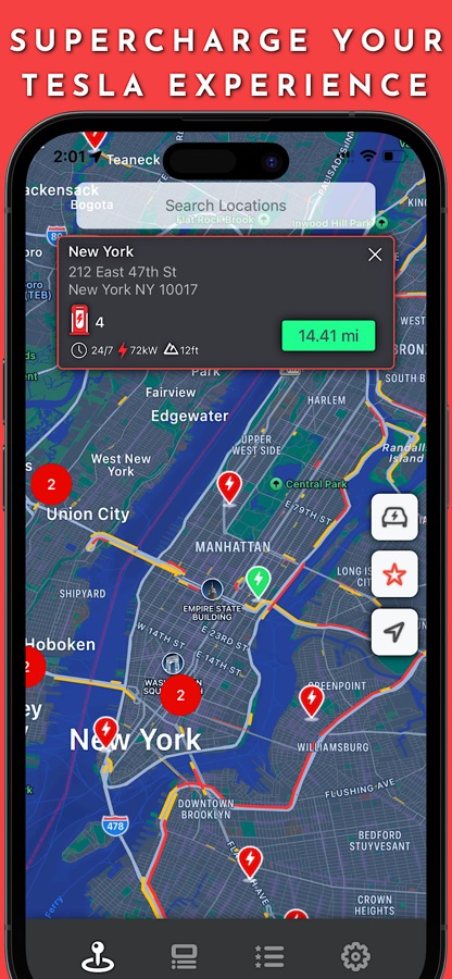 Instantly find the nearest Tesla superchargers around your location with one single tap to open the app. You can also find superchargers around any address or city around the world. Supercharge your Tesla experience with this convenient and powerful app designed to help you better plan your trips and get rid of range anxiety.