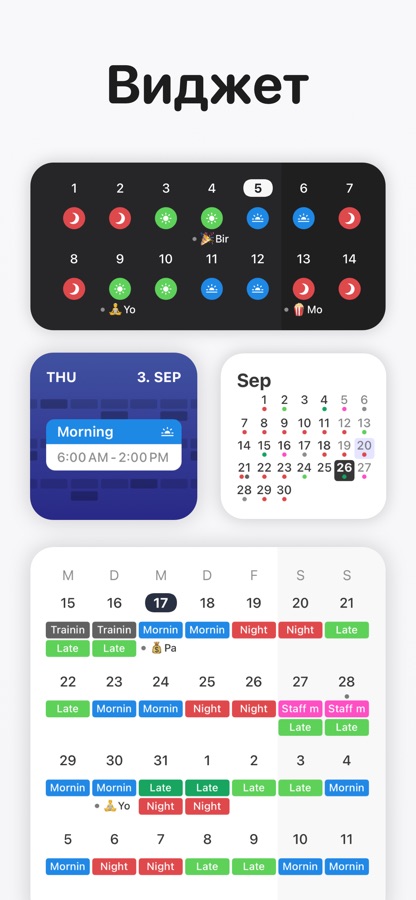 Дни рождения, встречи и другие события из внешних календарей (например, Google Календаря или календаря iCloud) могут отображаться наряду с вашими сменами.