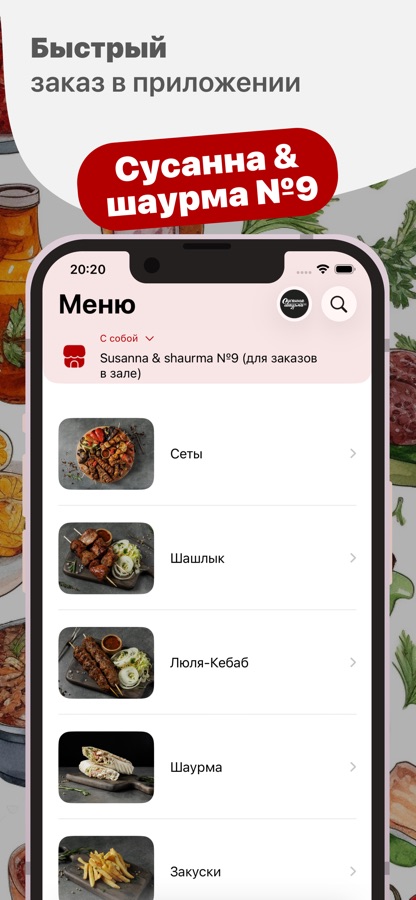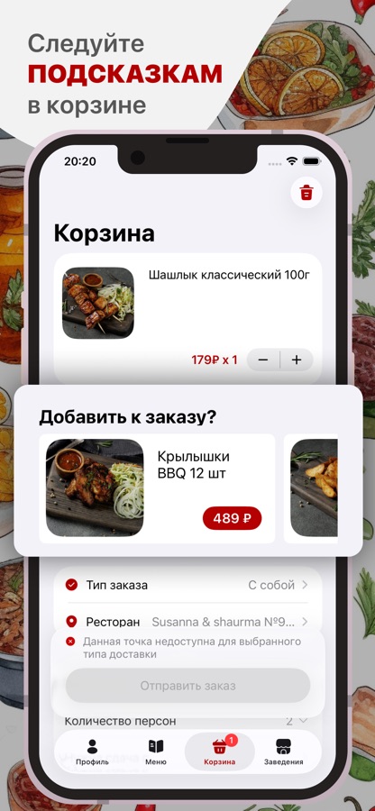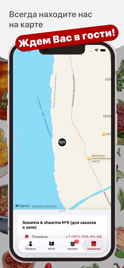 Как сделать заказ в приложении “Susanna & shaurma №9”: выберите понравившиеся позиции из меню, добавьте их в корзину и перейдите на экран оформления заказа (по нажатию на иконку корзины).