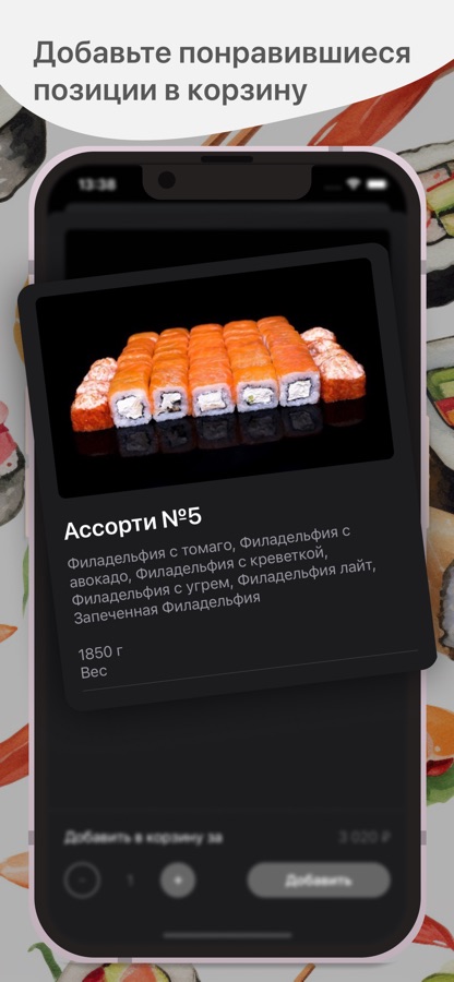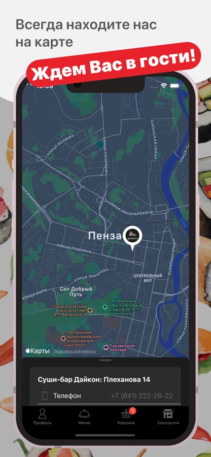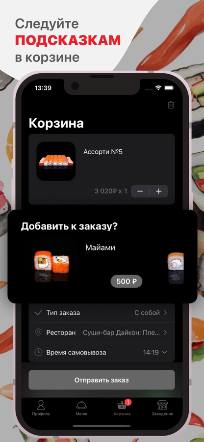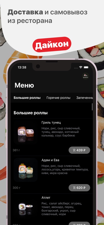 Как сделать заказ в приложении “Суши-Бар Дайкон”: выберите понравившиеся позиции из меню, добавьте их в корзину и перейдите на экран оформления заказа (по нажатию на иконку корзины).
