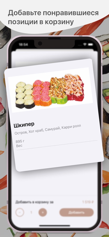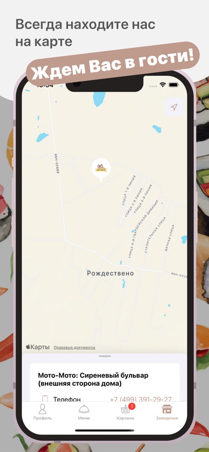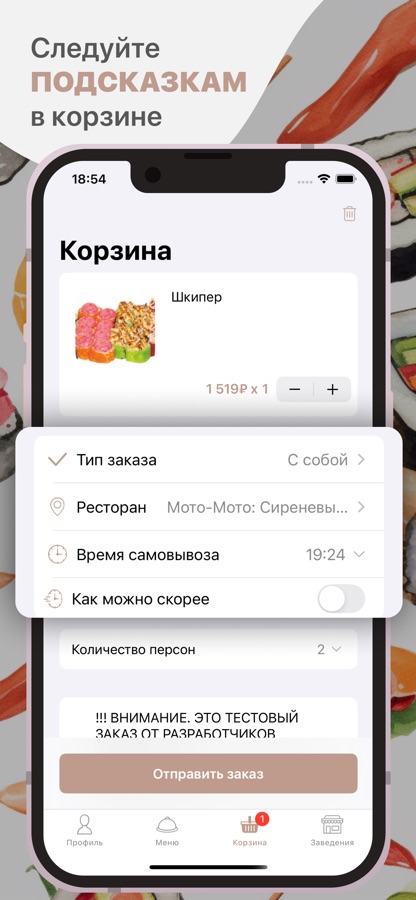 Как сделать заказ в приложении “Суши Мото-Мото”: выберите понравившиеся позиции из меню, добавьте их в корзину и перейдите на экран оформления заказа (по нажатию на иконку корзины).