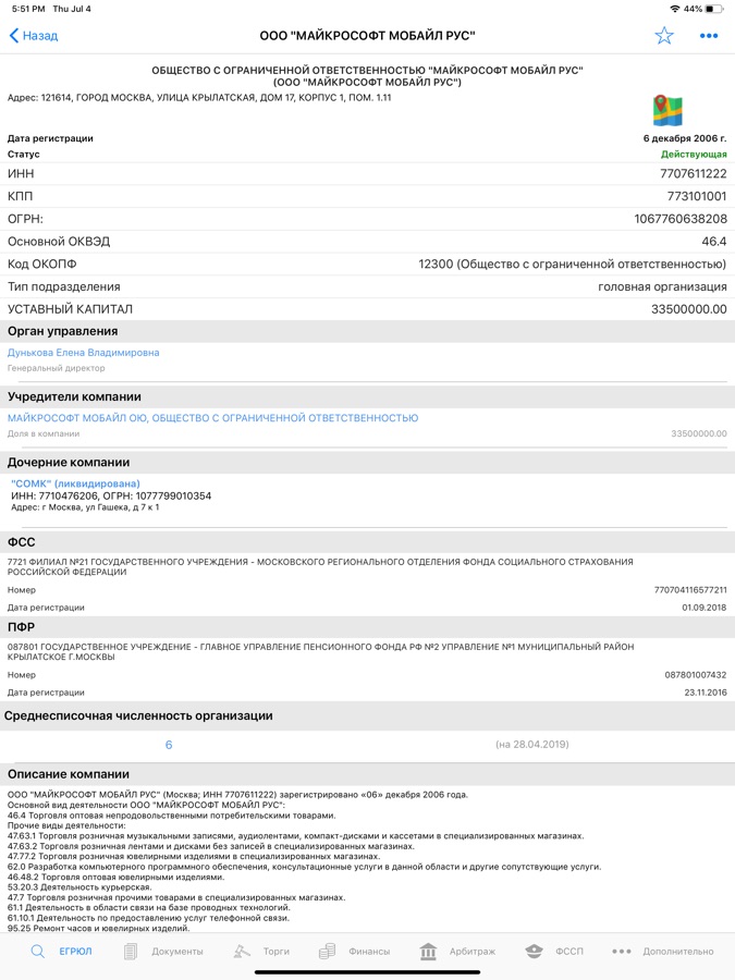 Приложение 7docs – (Сведения об организациях из ЕГРЮЛ/ЕГРИП) — это полная база сведений о юридических и физических лицах, представленная по данным ЕГРЮЛ, ЕГРИП. Другими словами данное приложение представляет собой инструмент, позволяющий по названию компании, инн или огрн компании, или даже по фио руководителя или учредителя организации отслеживать информацию об организации (когда и где была зарегистрирована компания, кто является генеральным директором, какой адрес у организации тд).