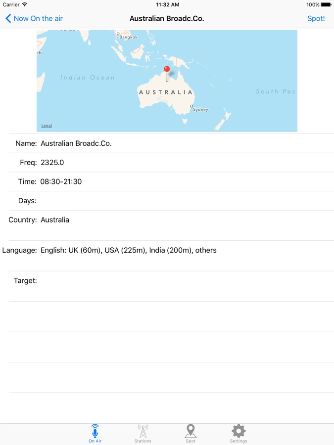 You can view the list of all current broadcasts (On the air) and all the information about the transmission (language, transmitter position, target etc)
