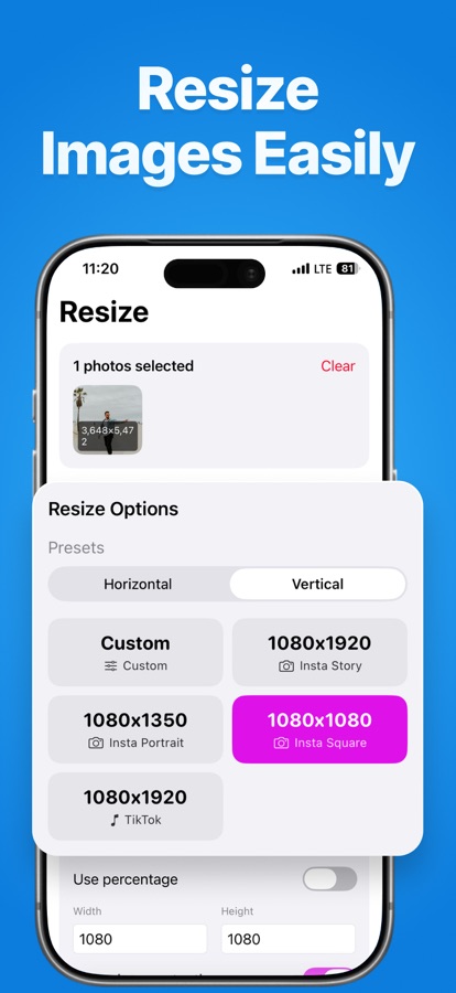 — Точное Изменение Размера: Изменяйте изображения до точных пикселей. Поддержка социальных сетей, веб, электронной почты, хранения. Изменяйте размер фото и сжимайте изображения вместе.