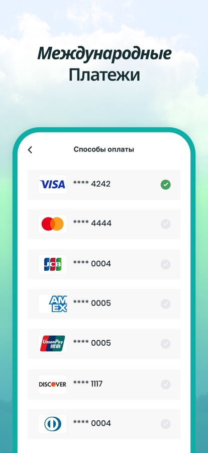 Глобальные способы оплаты: принимаются Visa, Mastercard, American Express, Discover, Diners Club, JCB и UnionPay.