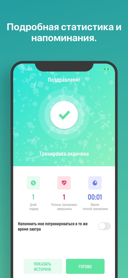 ∙ История и статистика для просмотра ваших предыдущих тренировок.