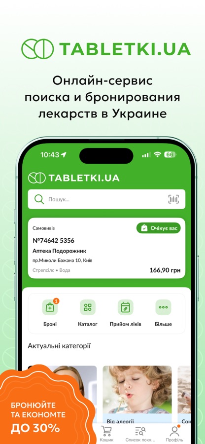 С помощью сервиса Tabletki ua вы сможете забронировать медицинские товары (лекарства / таблетки / медикаменты / витамины / пищевые добавки), косметику, товары для мам и малышей, товары для женщин, средства гигиены, средства красоты и здоровья, медицинскую технику.
