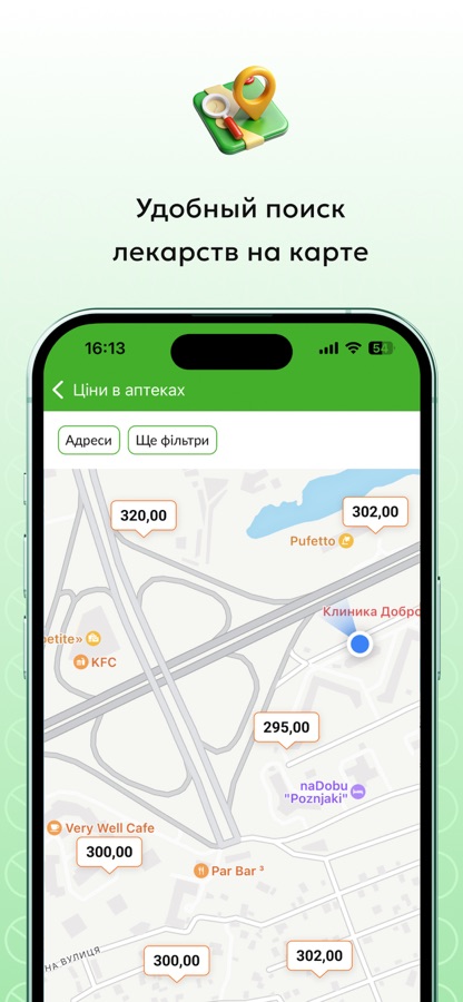 • не надо ходить по аптекам и искать товары – приложение найдет ближайшие аптеки, проверит наличие товара и покажет все на карте с указанием цены;