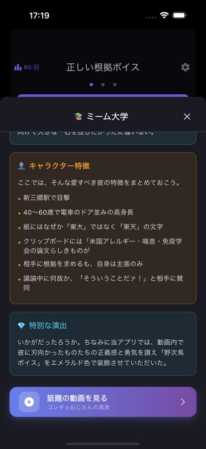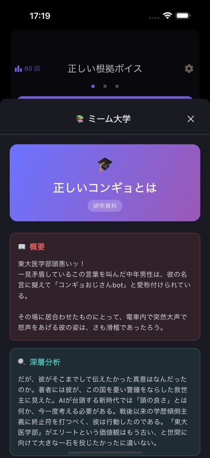 As shown by the popularity of Hiroyuki, today there is a need to improve communication skills, especially the ability to break down arguments. In this app, you can learn the debunking techniques of Kongyo, who destroyed the common belief that «Tokyo univiersity medical students are smart. In this way, we too can shed our preconceived notions. The purpose of developing this app is to help people to abandon their preconceived notions and to create disruptive innovations. In other words, the purpose of developing this application is to produce wonderful people who can create things.