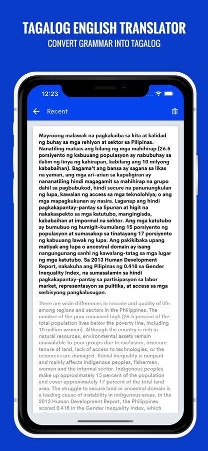 This free app is able to translate words and text from Tagalog to English, and from English to Tagalog.Best app for easy and fast translations, which can be used like a dictionary. If you are a student, tourist, or traveler, it will help you to learn the language!
