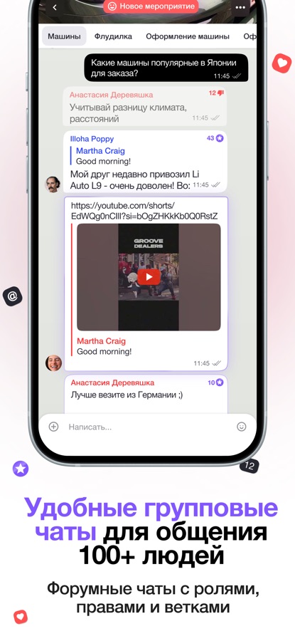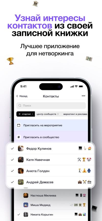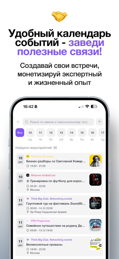 С помощью уникальной системы тегов ты можешь мгновенно находить тематические сообщества, мероприятия и события рядом или по всему миру. Хочешь познакомиться с людьми рядом, найти репетитора, онлайн доктора или мастера для дома? Нужен чат знакомств или совет от профессионала? Просто выбери подходящие теги: «юристы футболисты в Сити», «Крипто бизнес», «маркетинг и стартап», «люди рядом», «Экспаты Москвы», «яхтинг Самара» и получи мгновенный доступ к нужным людям!