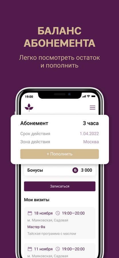 Легко посмотреть баланс абонемента и пополнить его. В приложении можно получить бонусы за активность и оплатить ими до 100% визита или абонемента.