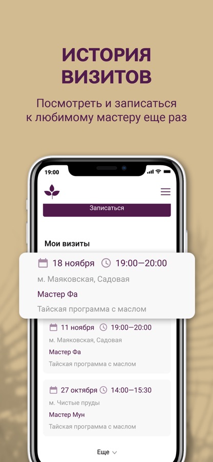 В приложении Тайрай сохраняется ваше имя и номер телефона, поэтому записаться на визит быстро и удобно. Можно выбрать программу по своим физическим и эмоциональным ощущениям. Например, арома-ойл для расслабления или спортивную программу для восстановления мышц.