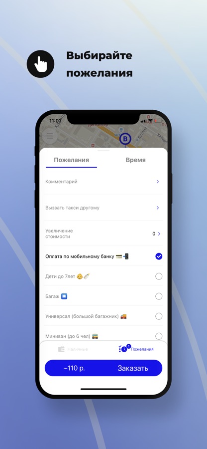 Добавьте к заказу дополнительные пожелания. Например, если вы не переносите запах табака — укажите «Некурящий салон», и к вам приедет некурящий водитель. Также вы можете выбрать автомобиль с увеличенным багажником или попросить водителя помочь с сумками.