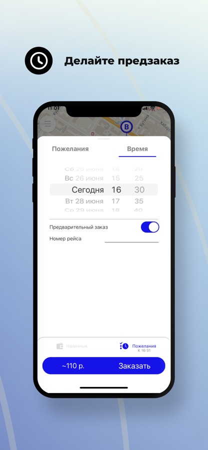 Выберите опцию “Предварительный заказ”. Поиск автомобиля начнется незадолго до заказа поездки, и автомобиль приедет к назначенному времени. Также вы будете заранее знать стоимость поездки.