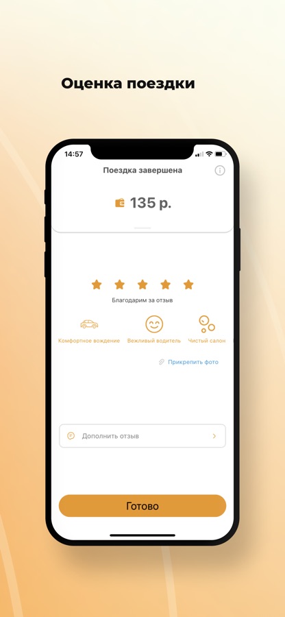 Поставьте оценку водителю, напишите отзыв или выберите реакцию из готовых шаблонов. Прикрепите фотографию к отзыву, оставьте чаевые или посмотрите детализацию платежей после поездки.