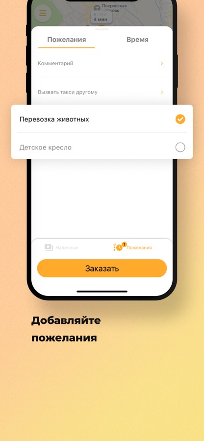 Используйте опцию “Вызвать такси другому” в разделе “Пожелания” и укажите его номер телефона. Когда такси подъедет, на указанный номер поступит звонок, а вам — сообщение в приложении.